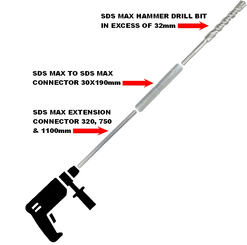 SDS Max to SDS Max Connector acts as a link between machine and drilling tools. Extension pieces are offered in a range of lengths: 320, 750 & 1100mm.